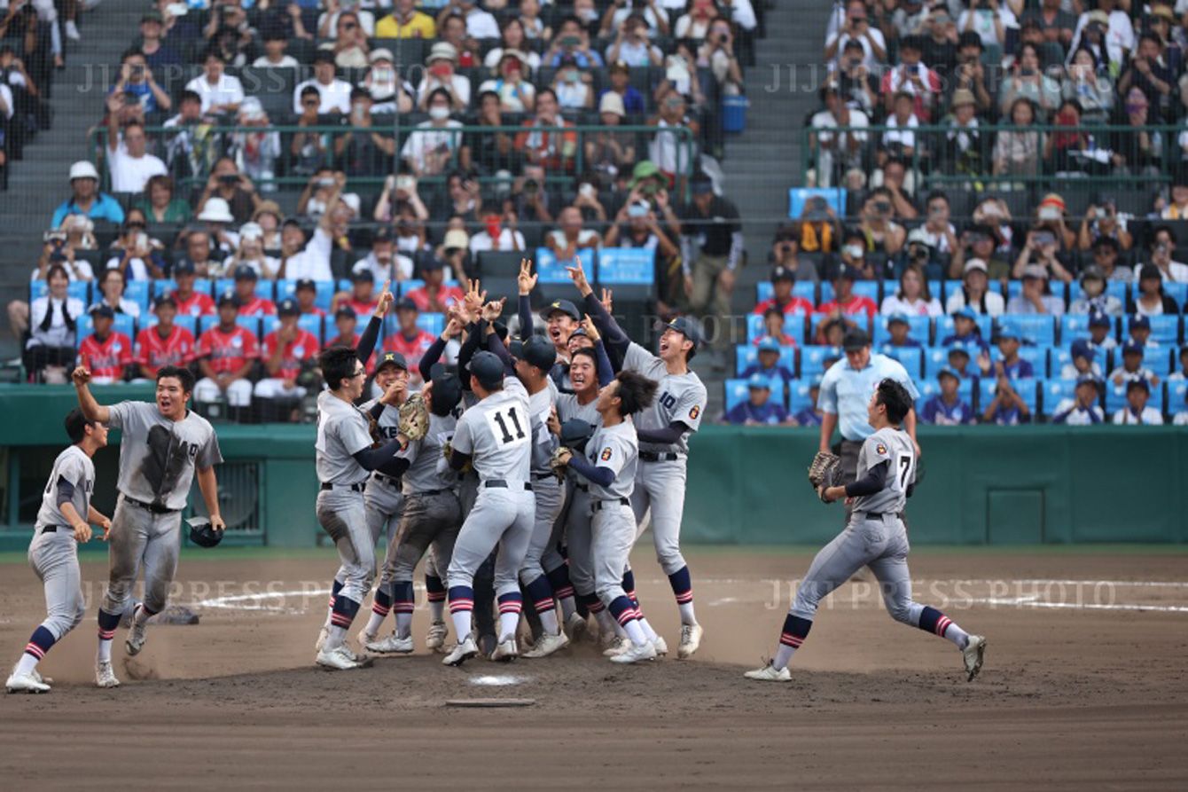 仙台育英を破り107年ぶりの優勝を果たし、喜ぶ慶應ナイン(=2023年8月23日、甲子園)