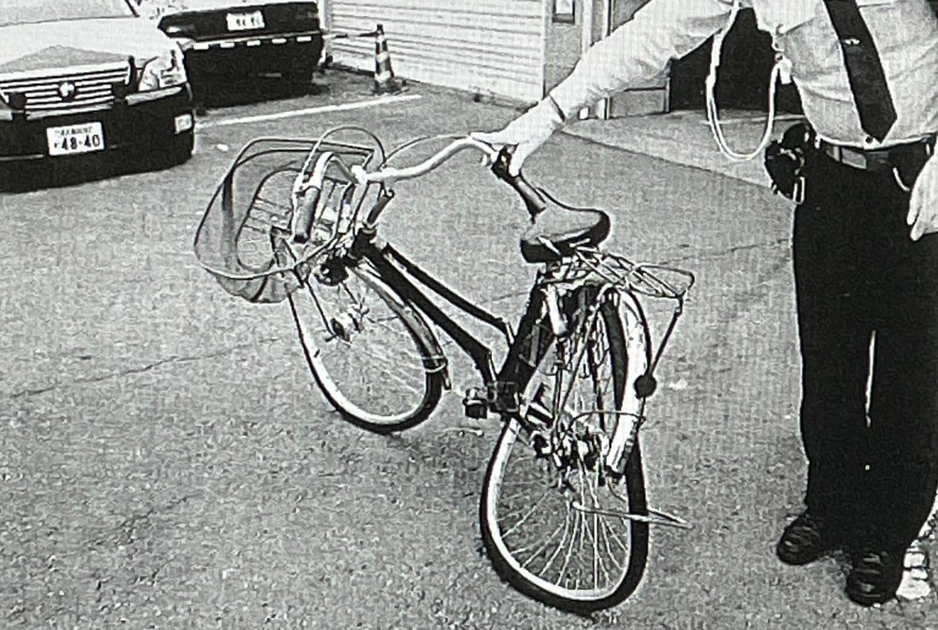 眞野貴仁さんが乗っていた自転車。乗用車に衝突され、大きく変形している