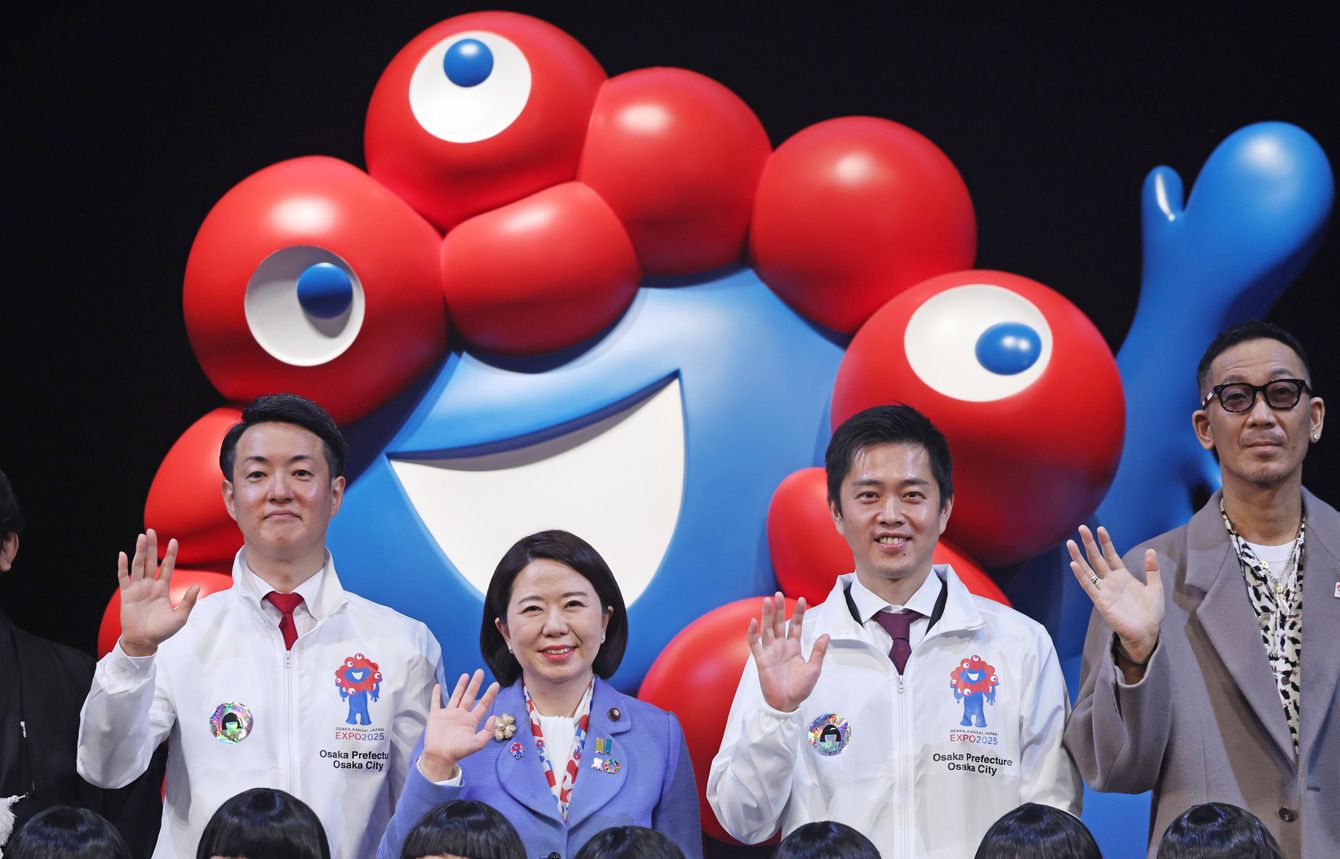 2025年大阪・関西万博の開幕500日前を記念するイベントで、手を振る(左から)大阪市の横山英幸市長、自見英子万博担当相、大阪府の吉村洋文知事ら(=11月30日、大阪市中央区)