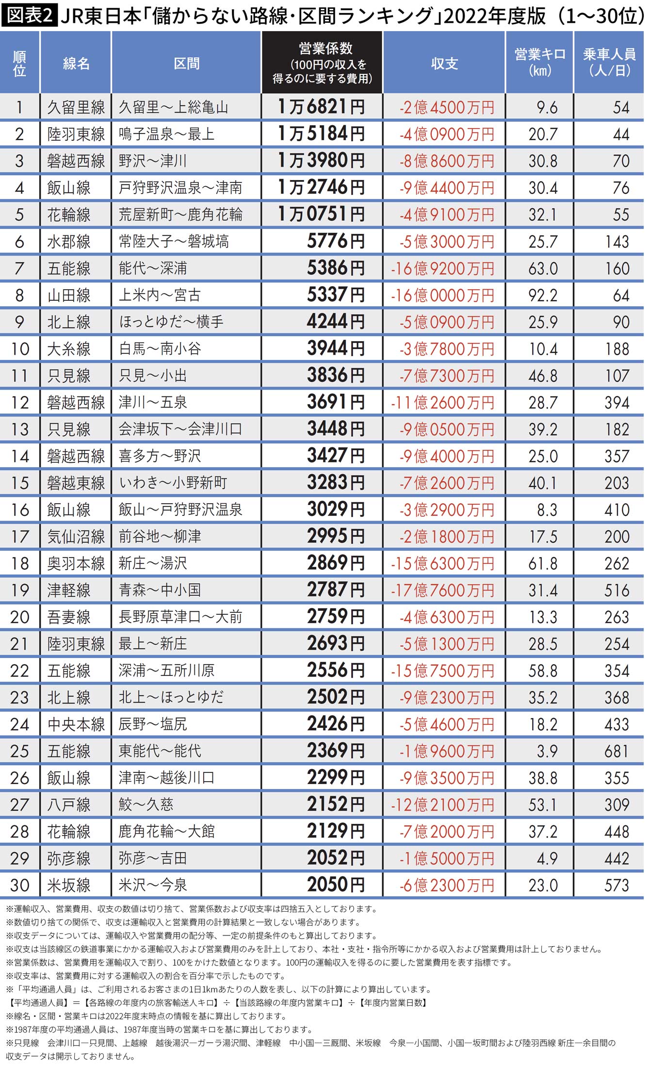 JR東日本ニュース「ご利用の少ない線区の経営情報(2022年度分)の開示について」(2023年11月21日)を基に筆者・編集部が独自に作成。