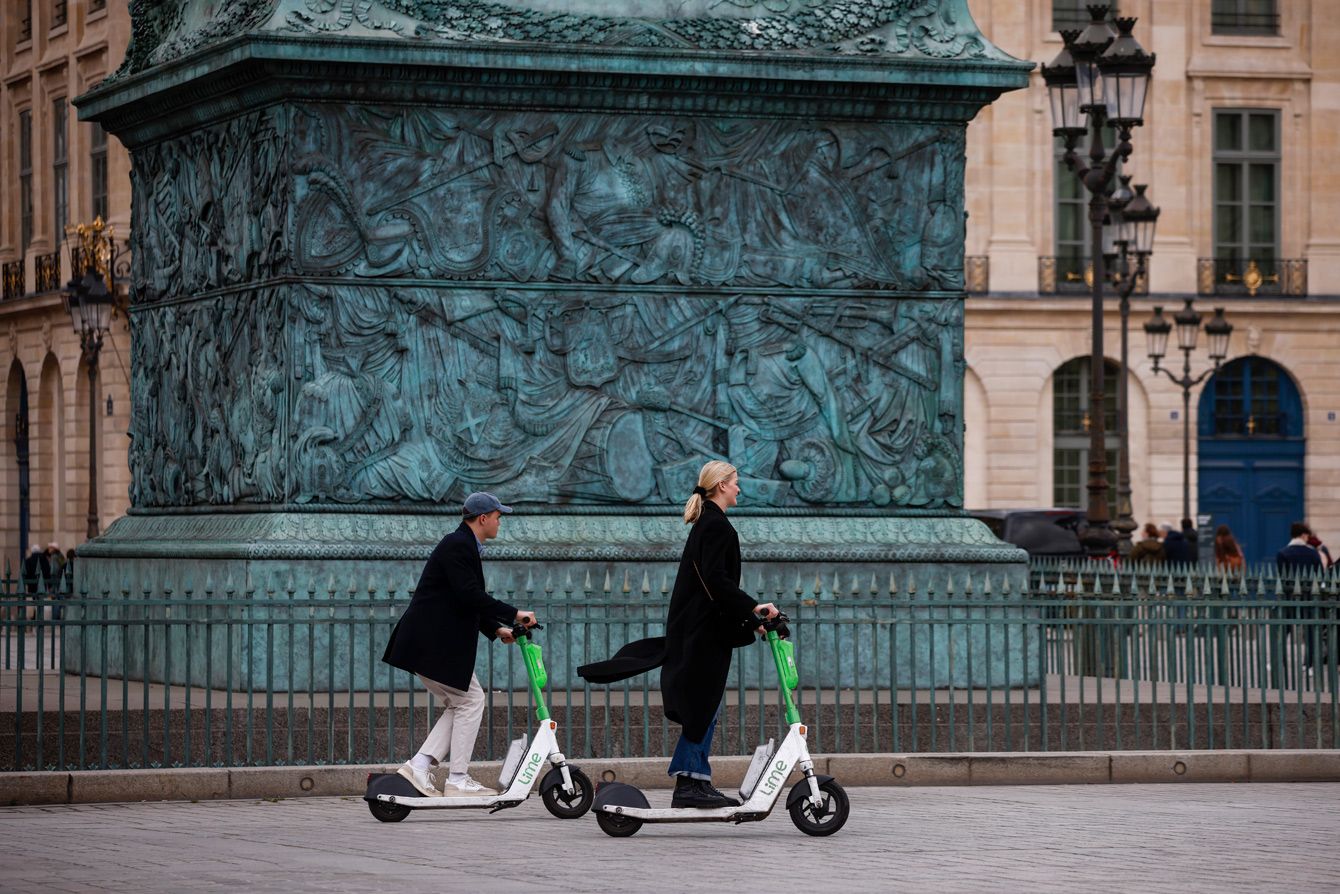 2023年4月1日、フランス・パリでシェアサービスの電動キックボードに乗る人々。4月2日、市内で使用されている電動キックボードを禁止するかを問う住民投票が行われ、投じられた9割が反対票だった