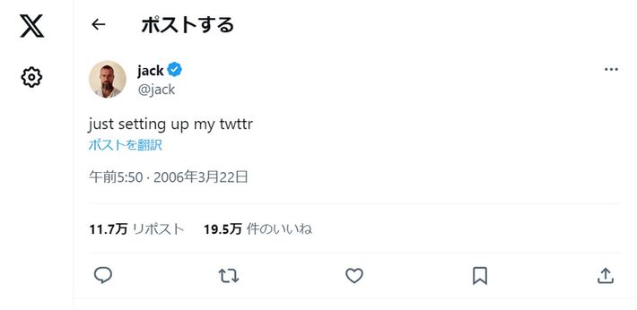 米ツイッターのジャック・ドーシーCEO(当時)が2006年に最初に投稿したツイート[Twitter(現X)よりキャプチャ]