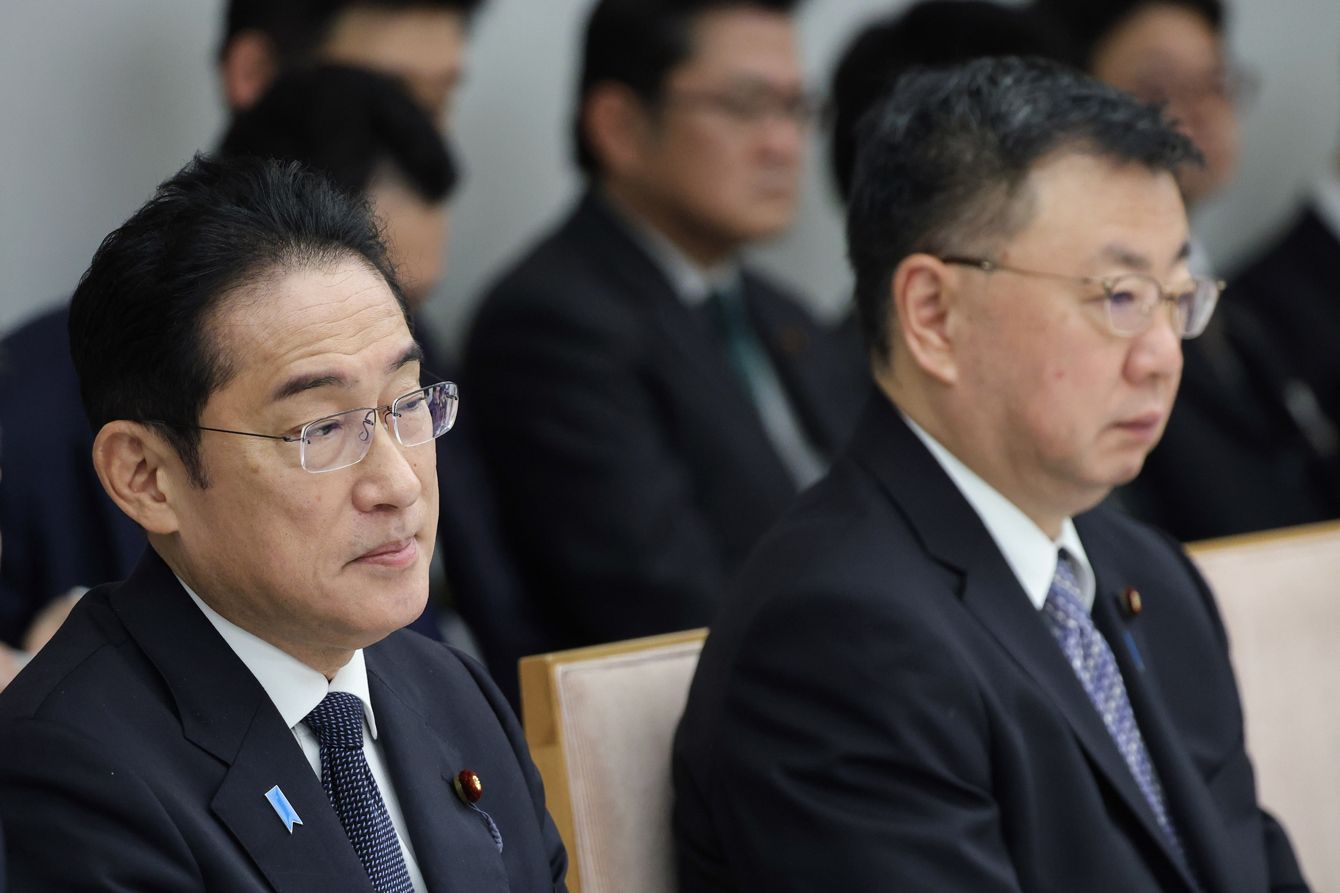 こども未来戦略会議に出席する岸田文雄首相(左)と松野博一官房長官(当時)=2023年12月11日、首相官邸