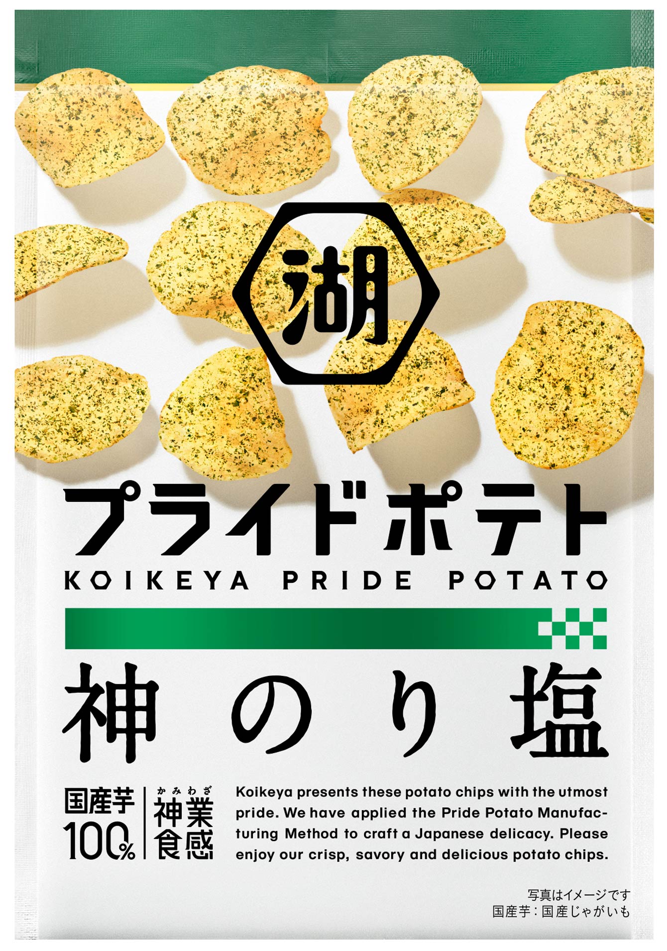 3種類ののり(青のり、あおさ、焼のり)を使用した「プライドポテト 神のり塩」(写真提供=湖池屋)