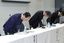 品質不正問題について記者会見し、陳謝する三菱電機の漆間啓社長(左)ら=2021年12月23日午後、東京都千代田区