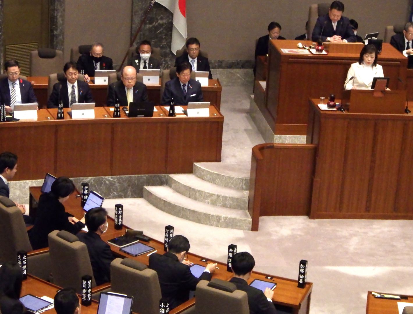 静岡県議会最終日の様子、委員長報告が行われている。