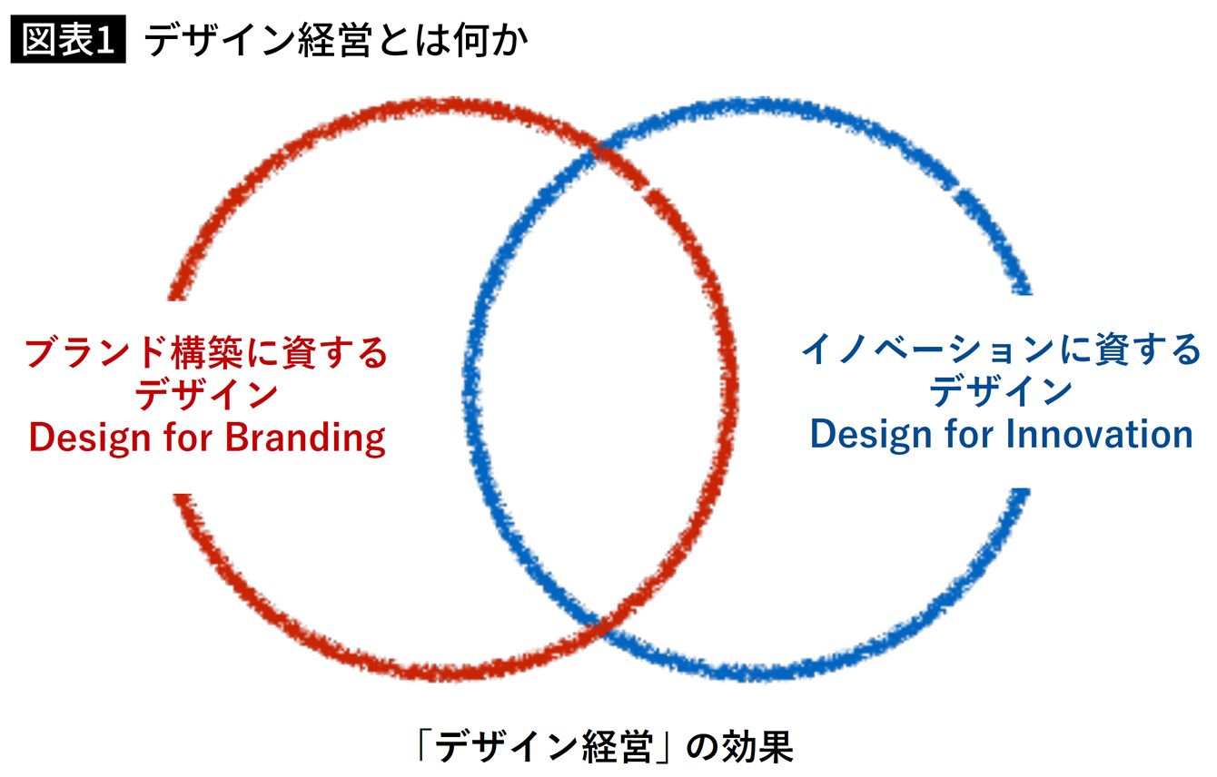 「デザイン経営」は、ブランド力向上とイノベーションを通じて、企業競争⼒の向上に寄与すること(図版=「
