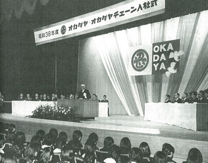 1963年、岡田屋は大卒者の定期採用を本格的にスタートさせた。「日本商業の父」倉本長治が入社式で新入社員たちを激励した。
