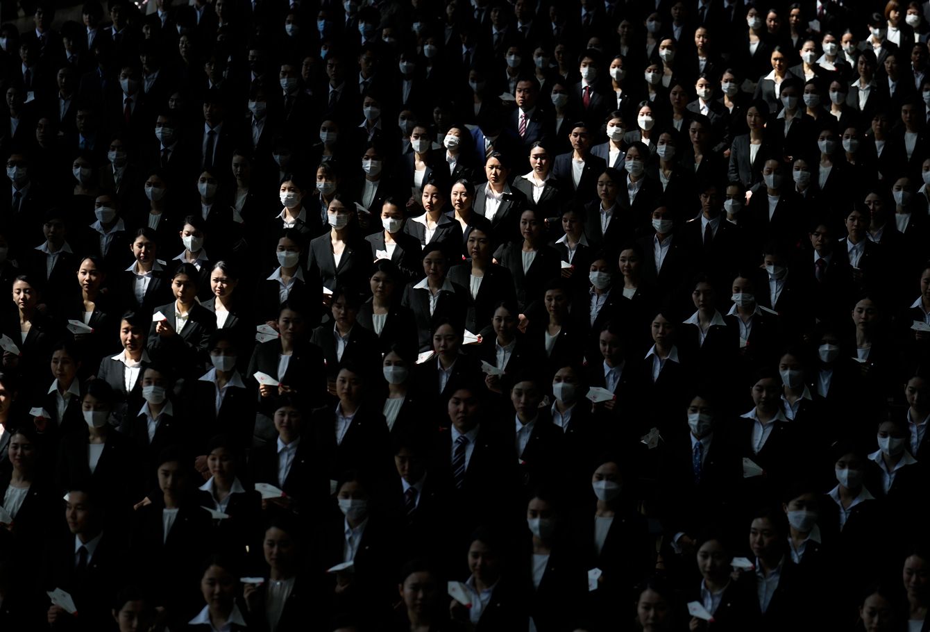 2023年4月3日、東京の羽田空港整備格納庫で行われた入社式に出席する日本航空グループ(JAL)の新入社員