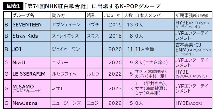 B=ボーイズグループ、G=ガールズグループ。※デビュー年は日韓で早い方の年