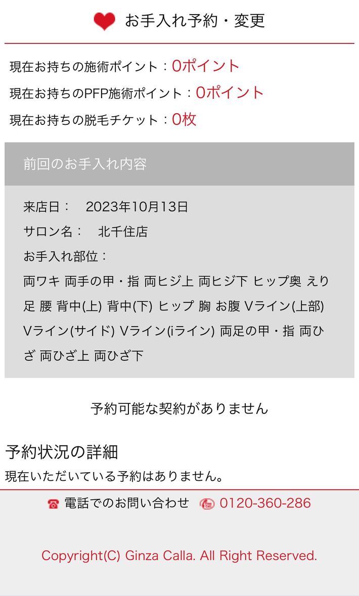 会員専用の予約ページ。現在は予約手続きに進めず、「予約可能な契約がありません」と表示されている