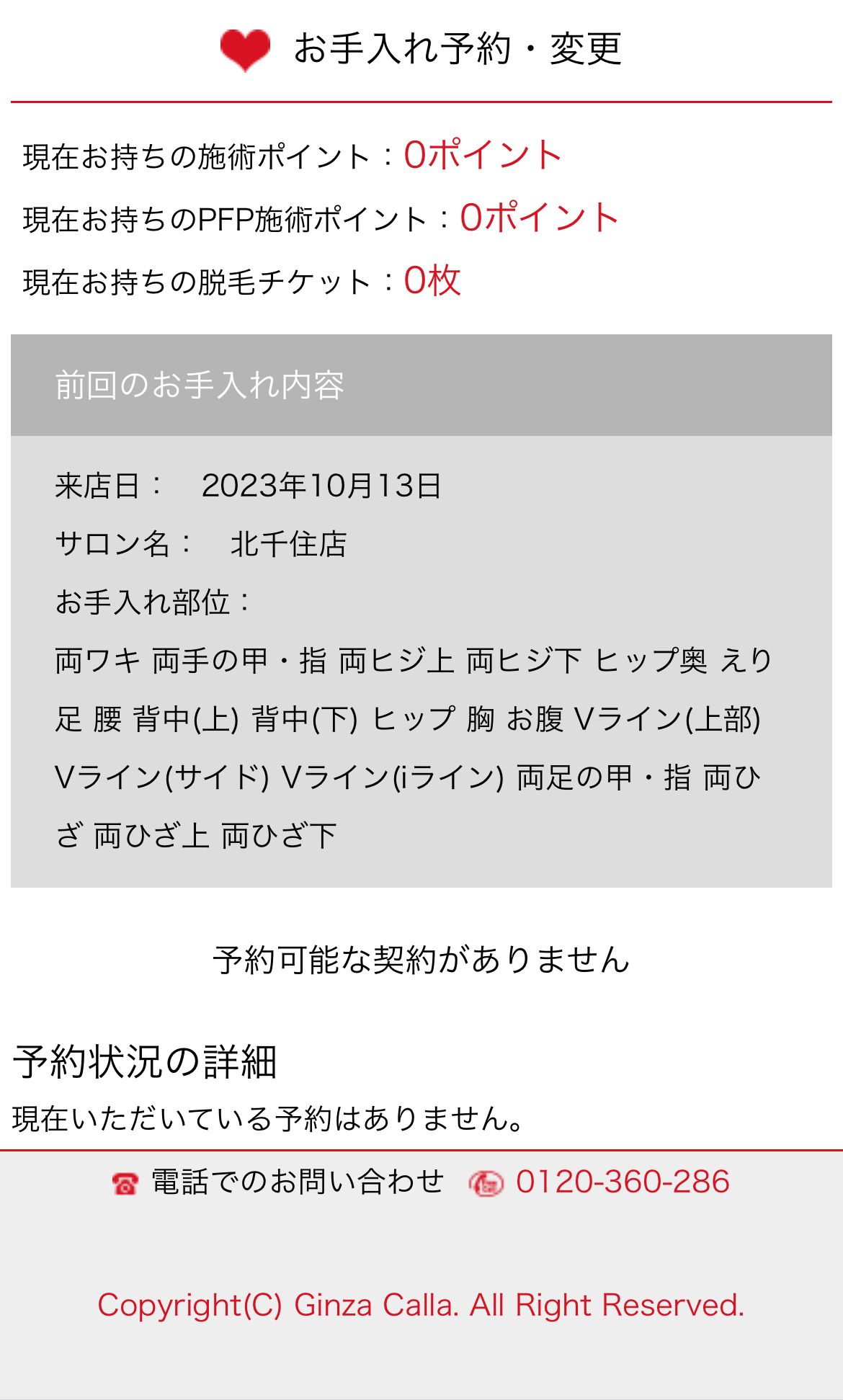 会員専用の予約ページ。現在は予約手続きに進めず、「予約可能な契約がありません」と表示されている