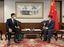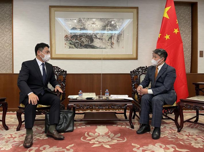 2021年10月20日、インタビュー取材に応じた「戦狼外交官」中国駐大阪総領事の薛剣氏(右)と向かい合う安田峰俊氏(左)