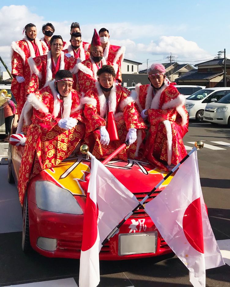 氏名が書かれた幟を掲げ、ド派手な衣装を着飾る新成人たち。これがスタンダード。(みやびのInstagramより)
