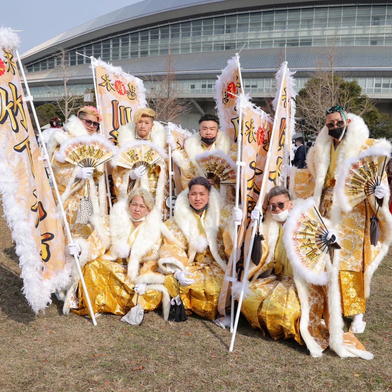 氏名が書かれた幟を掲げ、ド派手な衣装を着飾る新成人たち。これがスタンダード。(みやびのInstagramより)