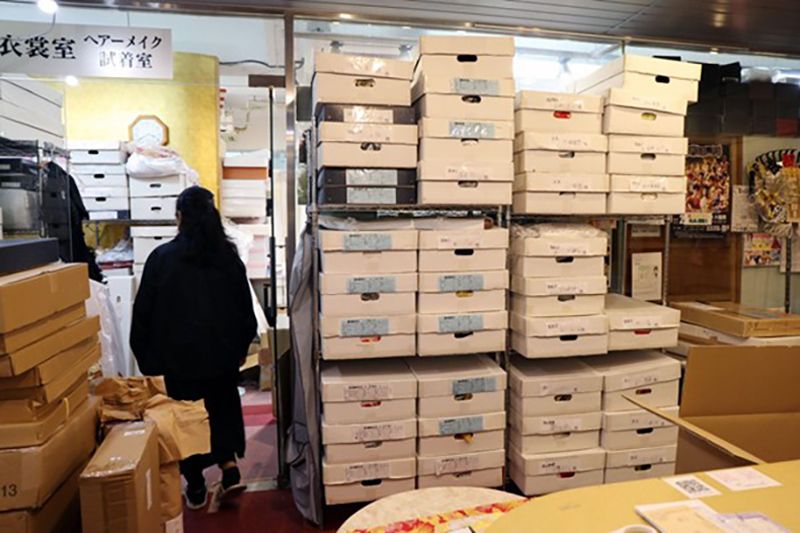 店内を案内する池田さん。一つひとつ名前が書かれた衣装ケースが天井まで積まれていた。(筆者撮影)