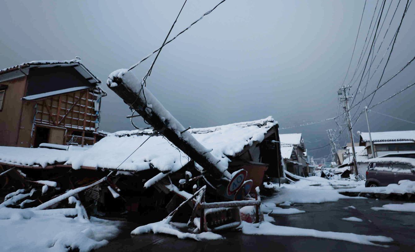 雪が降り積もった被災地=2024年1月8日午前、石川県珠洲市
