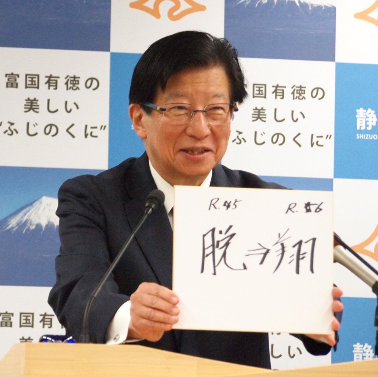 昨年の「脱」からことしの「翔」を掲げた川勝知事(静岡県庁)