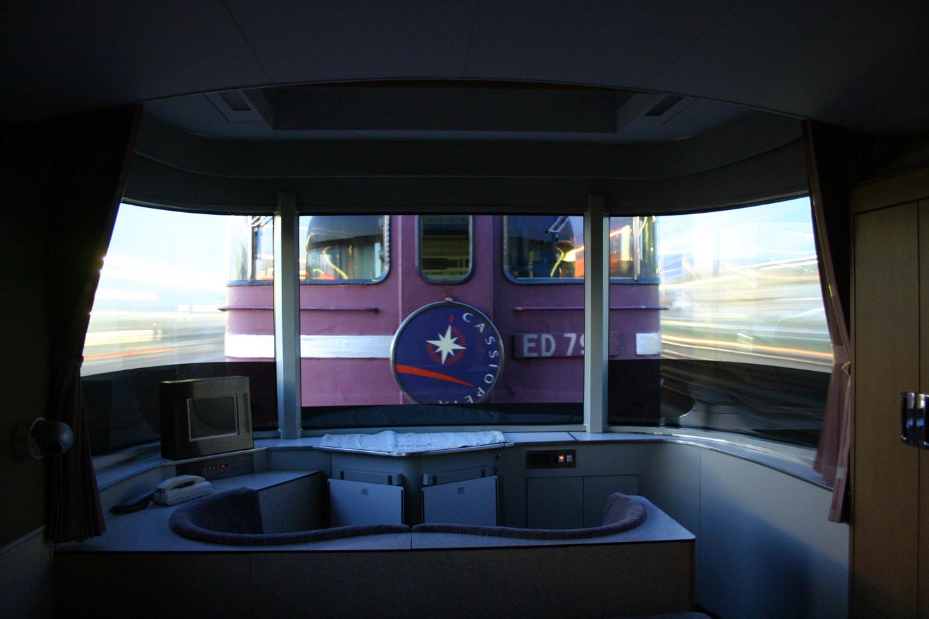JR東日本の「カシオペア」用寝台客車E26系、スロネフE26側。尾久―上野(日暮里―鶯谷)間にて。(写真=Sui-setz/PD-self/