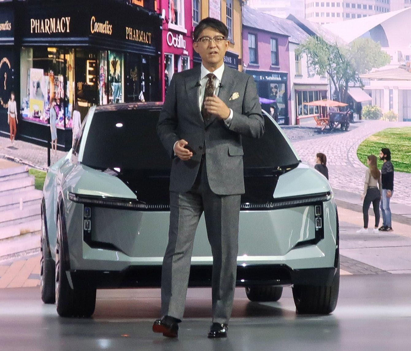 ジャパンモビリティショーで次世代電気自動車(EV)などを説明するトヨタ自動車の佐藤恒治社長=2023年10月25日午前、東京都江東区