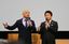 2025日本万国博覧会誘致委員会の発足式典であいさつするお笑いコンビ「ダウンタウン」の浜田雅功さん(右)と松本人志さん=2017年3月27日、東京都千代田区