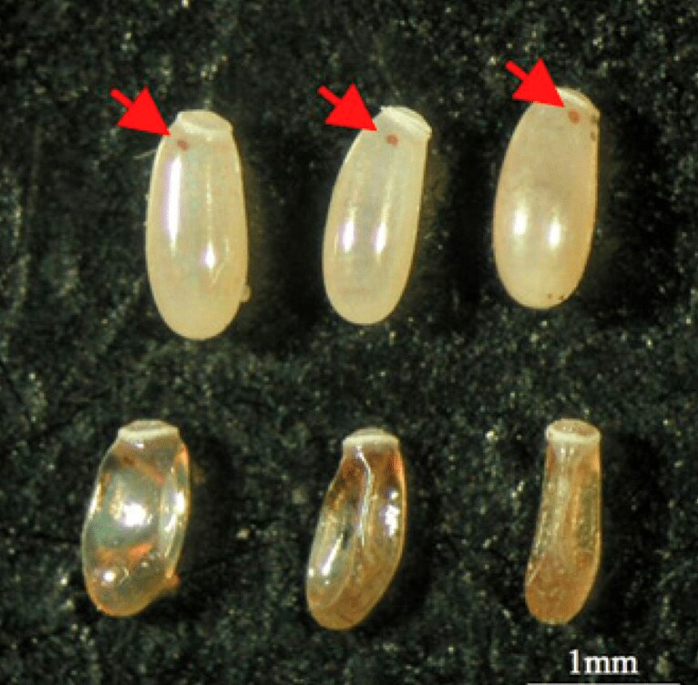 トコジラミの卵。上段はふつうのメスが産んだ卵で正常に発生 しており、赤い眼点が見える。下段は抗生物質処理で共生細 菌ボルバキアを除去したメスが産んだ卵で、発生がうまくい かず死ぬものが続出する。