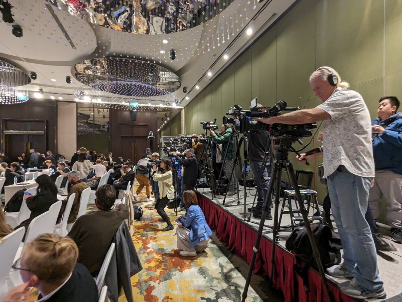 欧米メディアの取材チームの姿も目立った(1月11日、国際記者会見場にて)