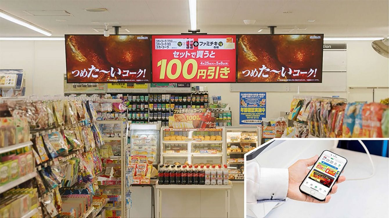 コカ・コーラ3種とファミチキのセットで100円を割引くキャンペーンを告知するデジタルサイネージの動画とアプリ「ファミペイ」内のバナー広告(右下)(出典=『