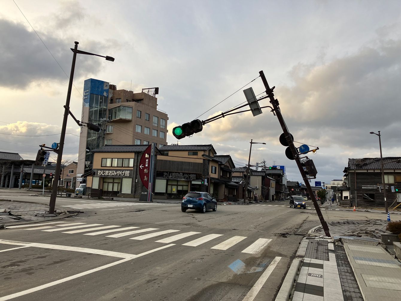 輪島市内ではあちこちで信号が傾いていた。
