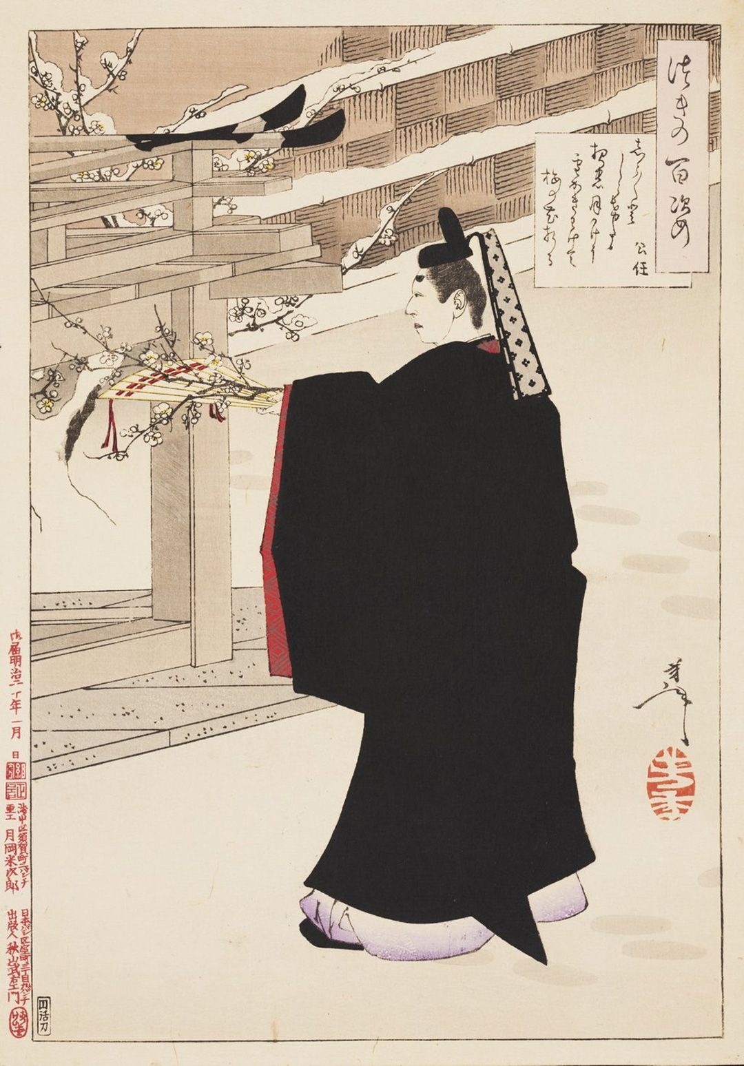 藤原公任の和歌『しらしらとしらけたる夜の月かけに 雪かきわけて梅の花折る』より(図版=月岡芳年作『月百姿 藤原公任』/CC-PD-Mark/