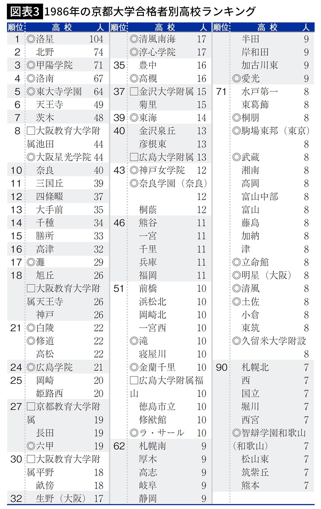 1986年の京都大学合格者別高校ランキング(出所=『