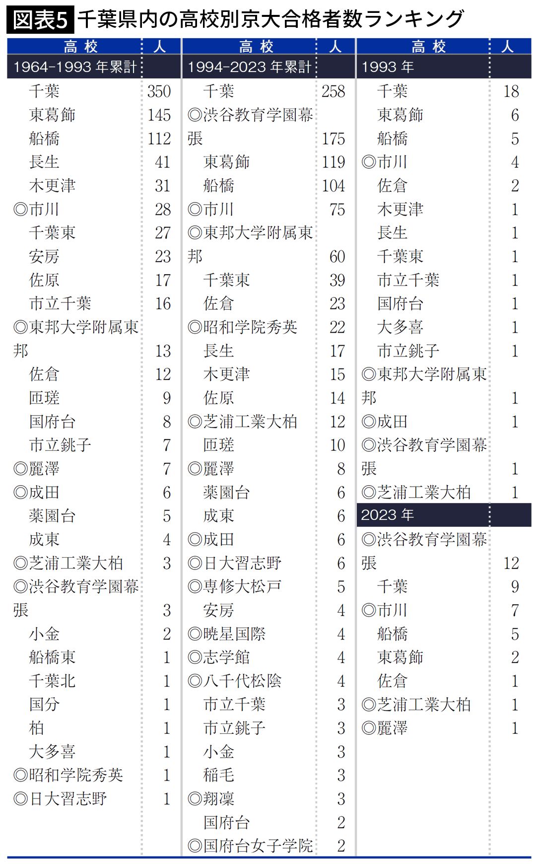 1964-1993年累計、1994-2023年累計、1993年、2023年における千葉県内の高校別京大合格者数ランキング(出所=『
