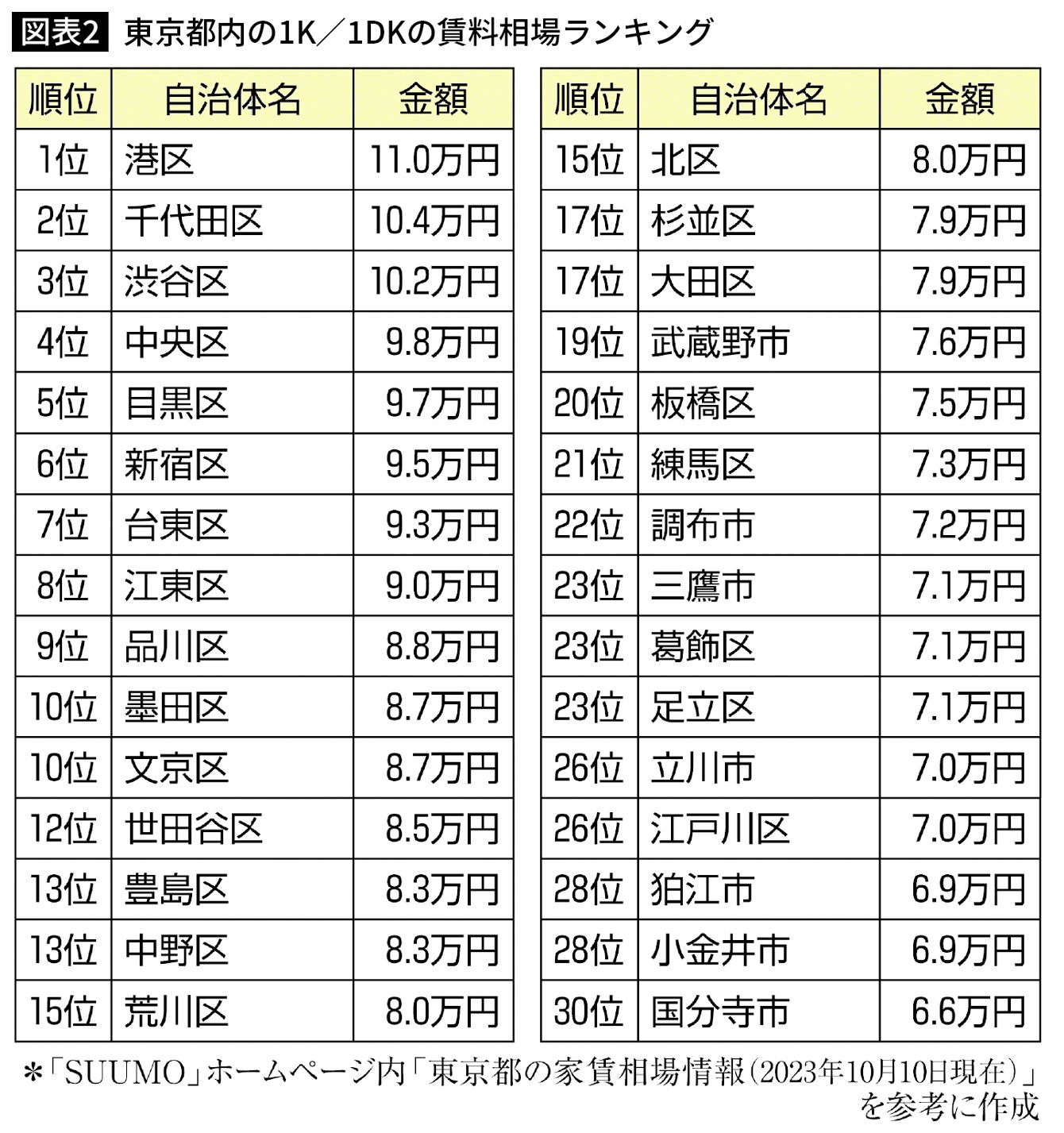 東京都内の1K/1DKの賃料相場ランキング(出所=『