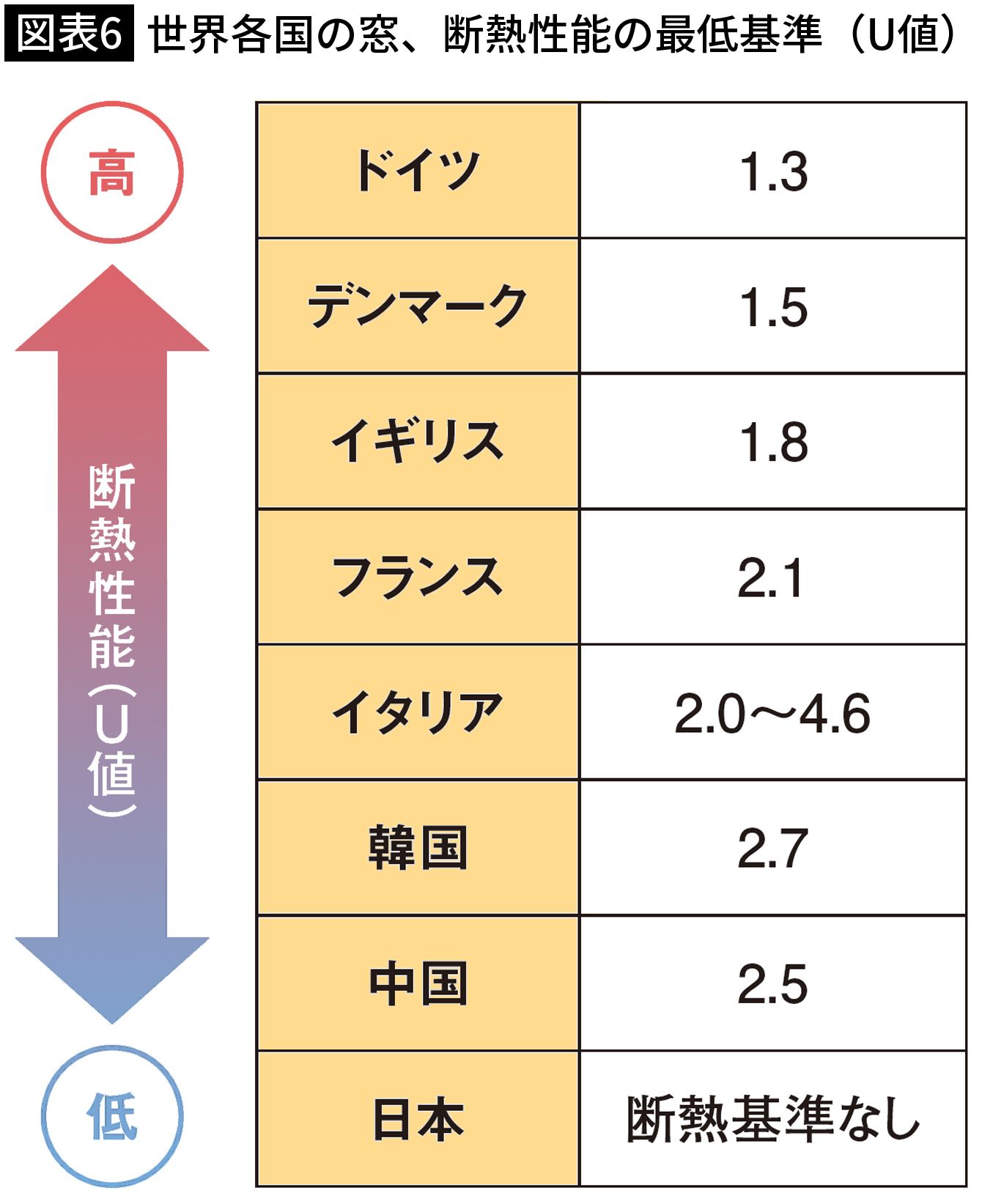世界各国の窓、断熱性能の最低基準(U値)(出所=『