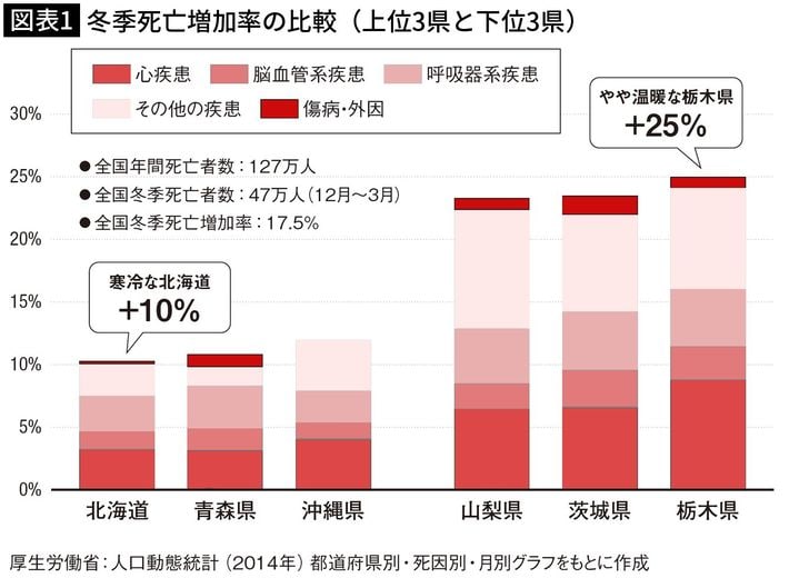 冬季死亡増加率の比較(上位3県と下位3県)(出所=『
