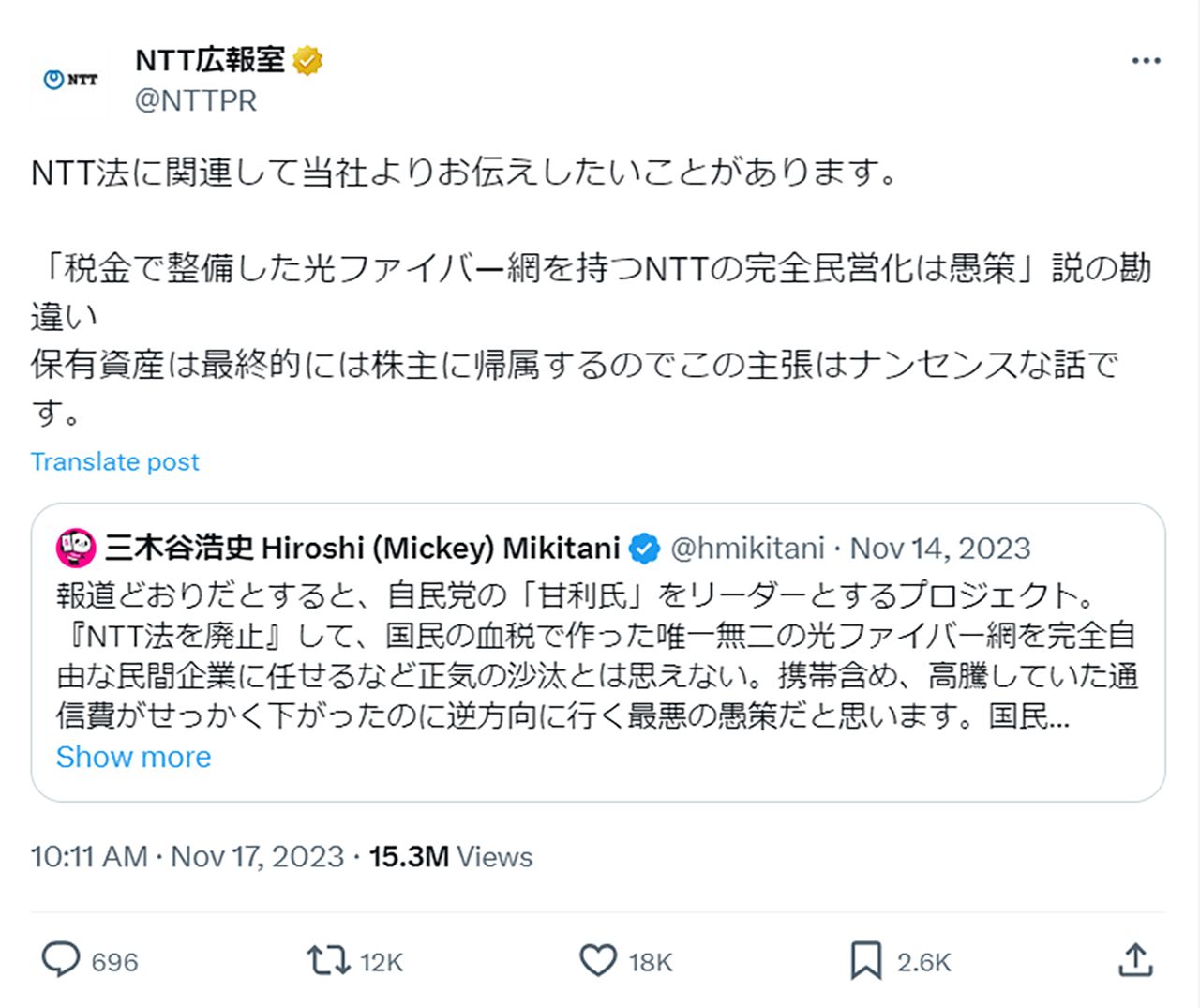 楽天三木谷氏の投稿に反論するNTT広報室(