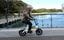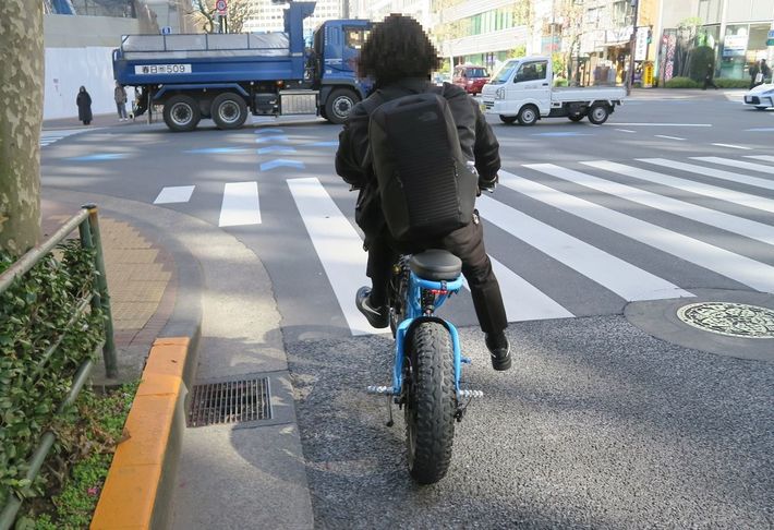 電動サイクルに乗る筆者。たしかに楽しいが、歩道の制限速度である時速6km/hで走るとふらついてしまう