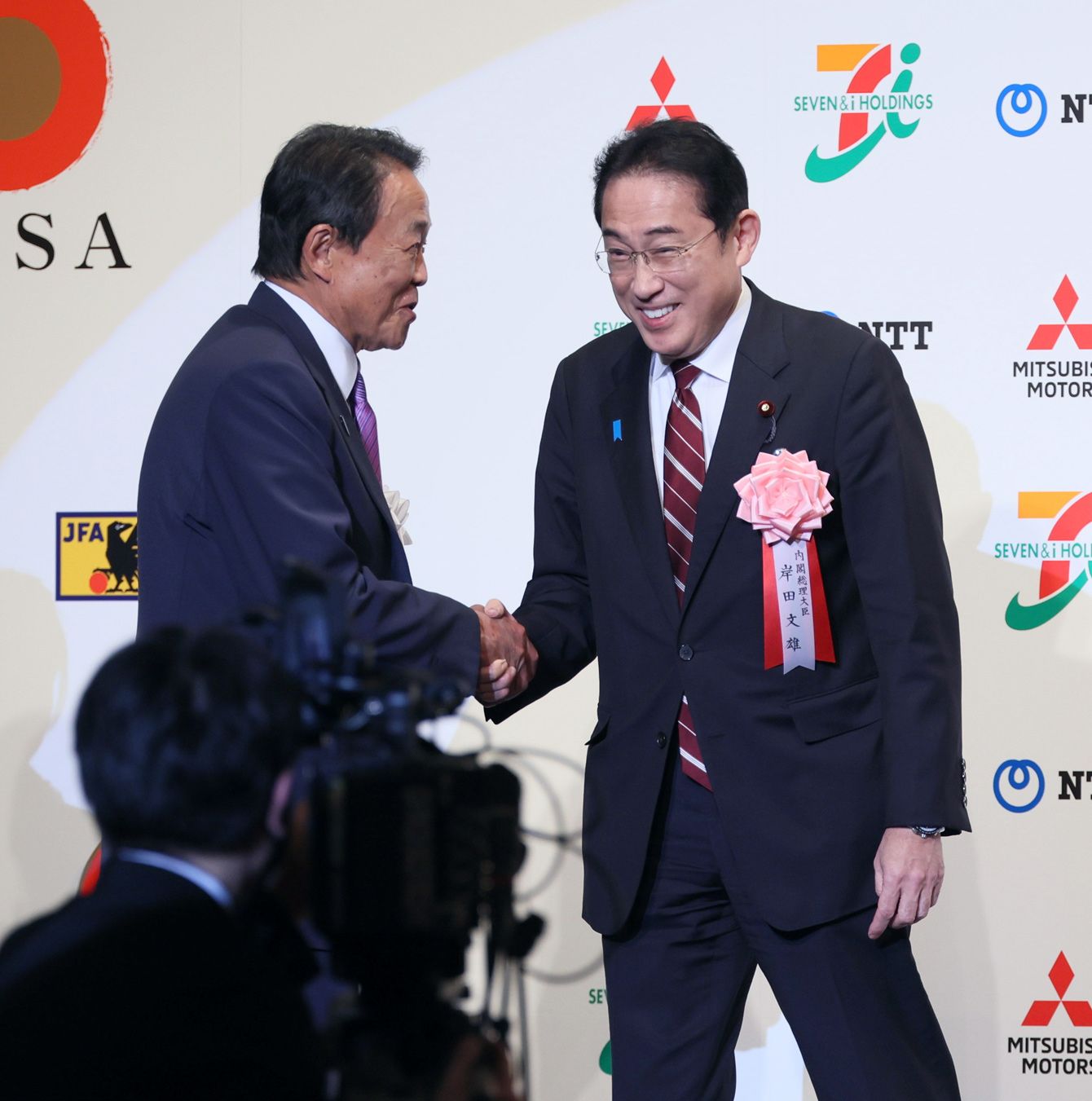 日本プロスポーツ大賞に出席し、笑顔で握手する岸田文雄首相(右)と麻生太郎自民党副総裁=2023年12月21日、東京都千代田区