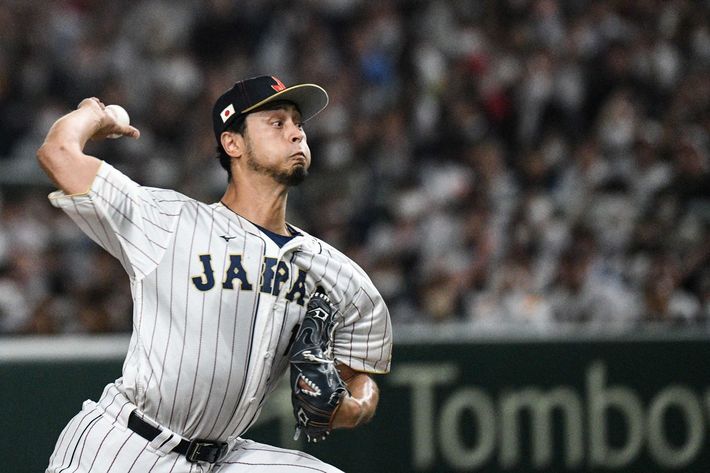 東京ドームで行われたワールド・ベースボール・クラシック(WBC)準々決勝、日本対イタリアの試合で投球する日本のダルビッシュ有投手(=2023年3月16日)