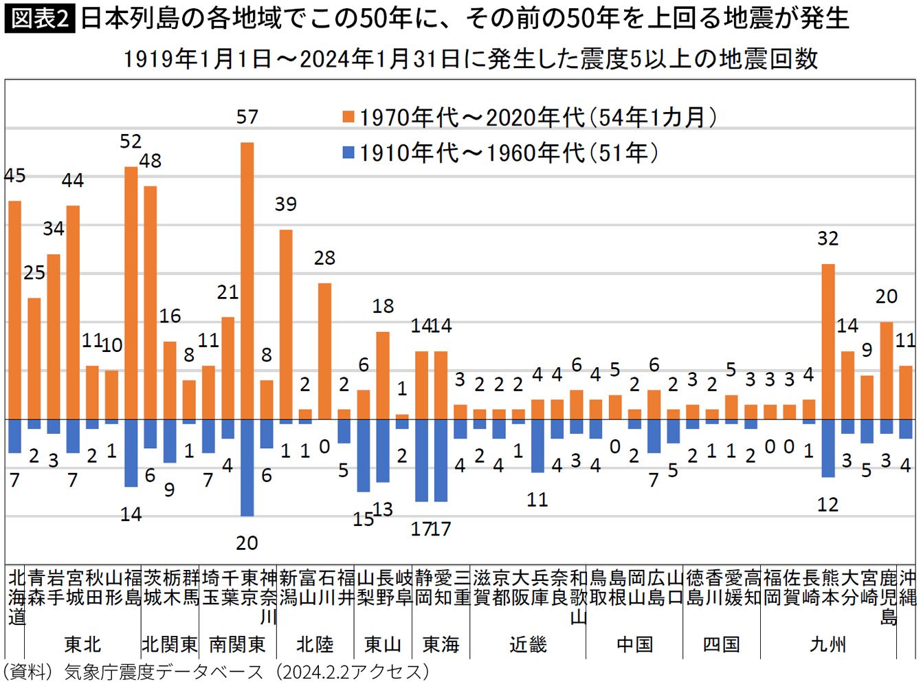 ここ50年で震度5以上の都道府県別回数…2位福島県52回、4位北海道45回、9位石川県28回で、衝撃の1位は?