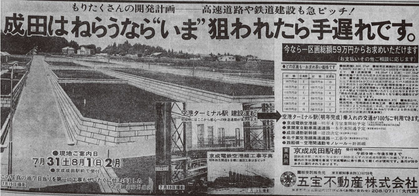 投機的に売買された千葉県多古町の分譲地の広告。成田空港の開港に合わせ、買い手を煽る文句が並ぶ。(1971年7月31日付読売新聞)(出所=『