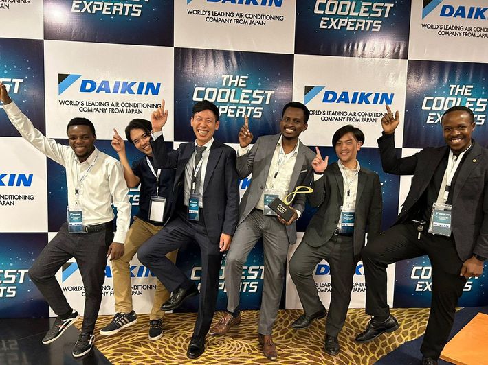 タンザニアで開かれたダイキン販売店のイベントに参加したBaridi Baridiの朝田浩暉CEO(左から3番目)と、同社の仲間たち