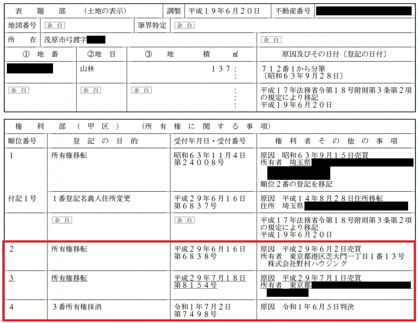 「野村ハウジング」の土地の登記事項証明書。いったんは東京都内在住の男性に売却されているが、その売買登記は判決によって抹消されている。