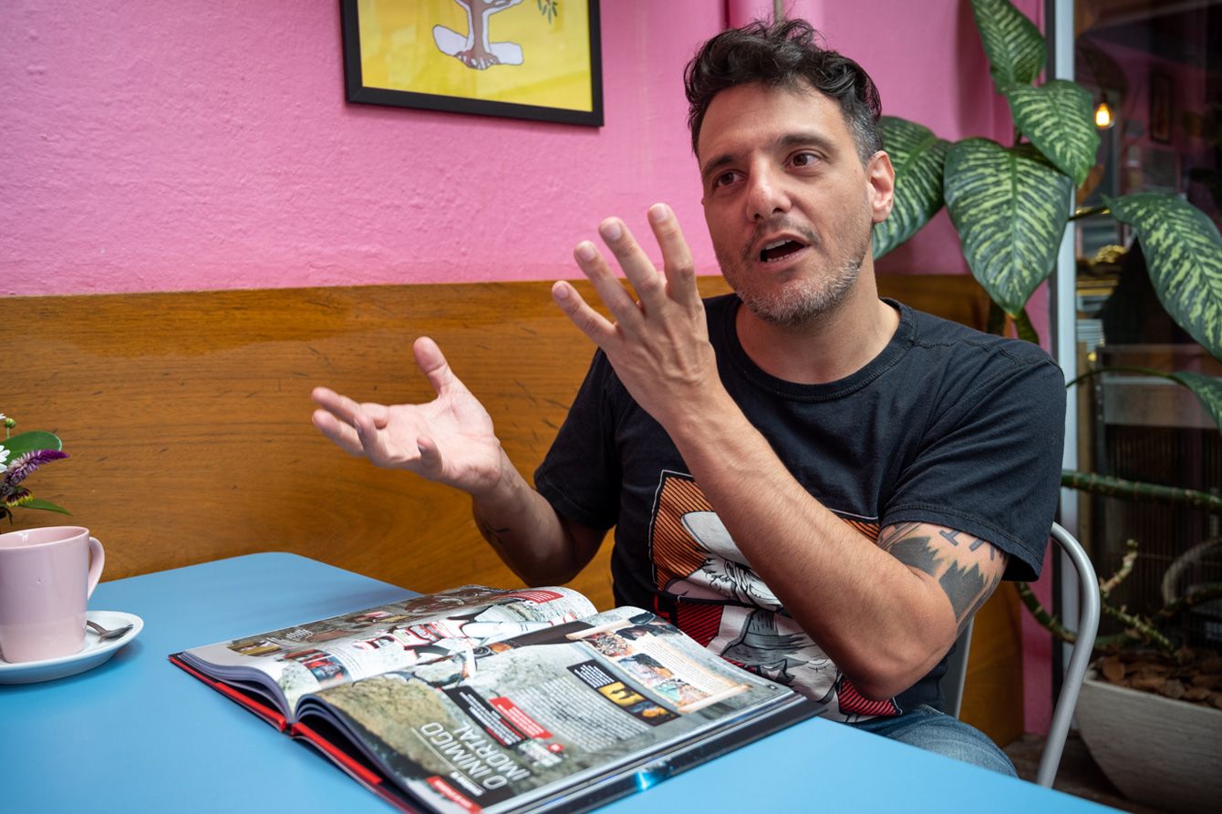 刊行されたばかりの『決定版ジャスピオン図鑑』を手にするヒカルド・クルーズさん