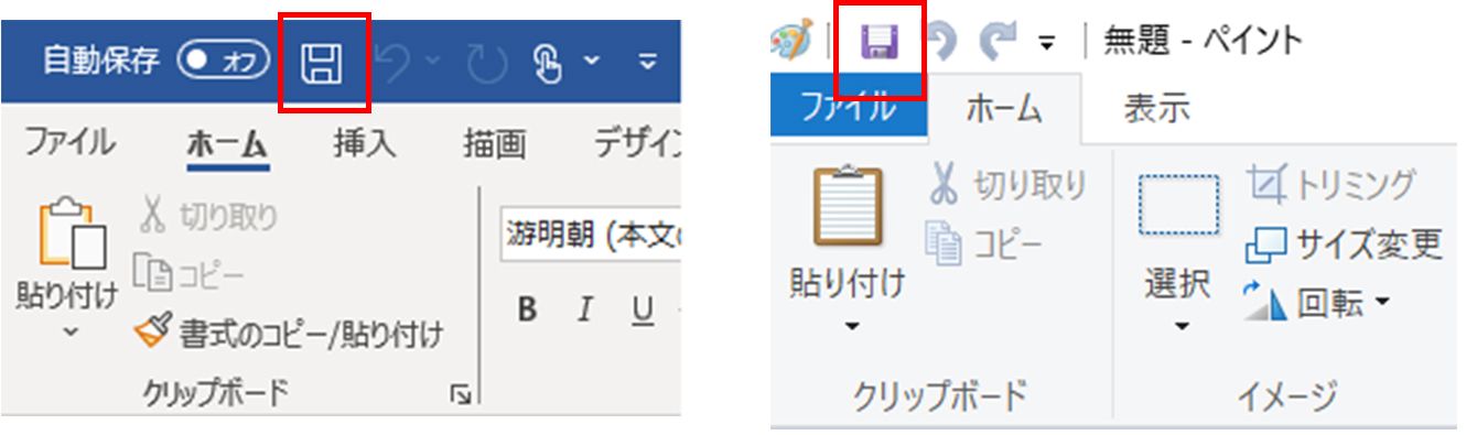 Wordソフトとペイントソフトの保存アイコン。FDの形になっている