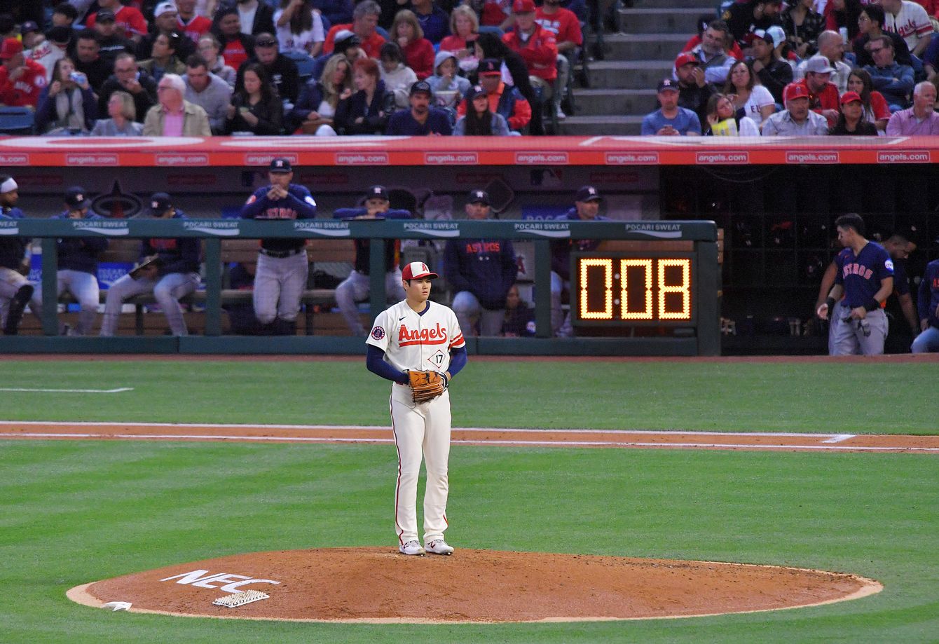 アストロズ戦に先発したエンゼルスの大谷翔平。奥の数字はピッチクロック(投球間の時間制限)=2023年5月9日、アメリカ・アナハイム