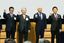 2025日本万国博覧会誘致委員会の発足式典で記念撮影する(左から)大阪府の松井一郎知事、経団連の榊原定征会長、お笑いコンビ「ダウンタウン」の松本人志さんと浜田雅功さん=2017年3月27日、東京都千代田区