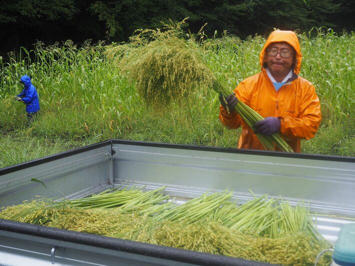 訪問した時はあいにくの雨。軽トラックに刈り取ったホウキモロコシを積んでいく