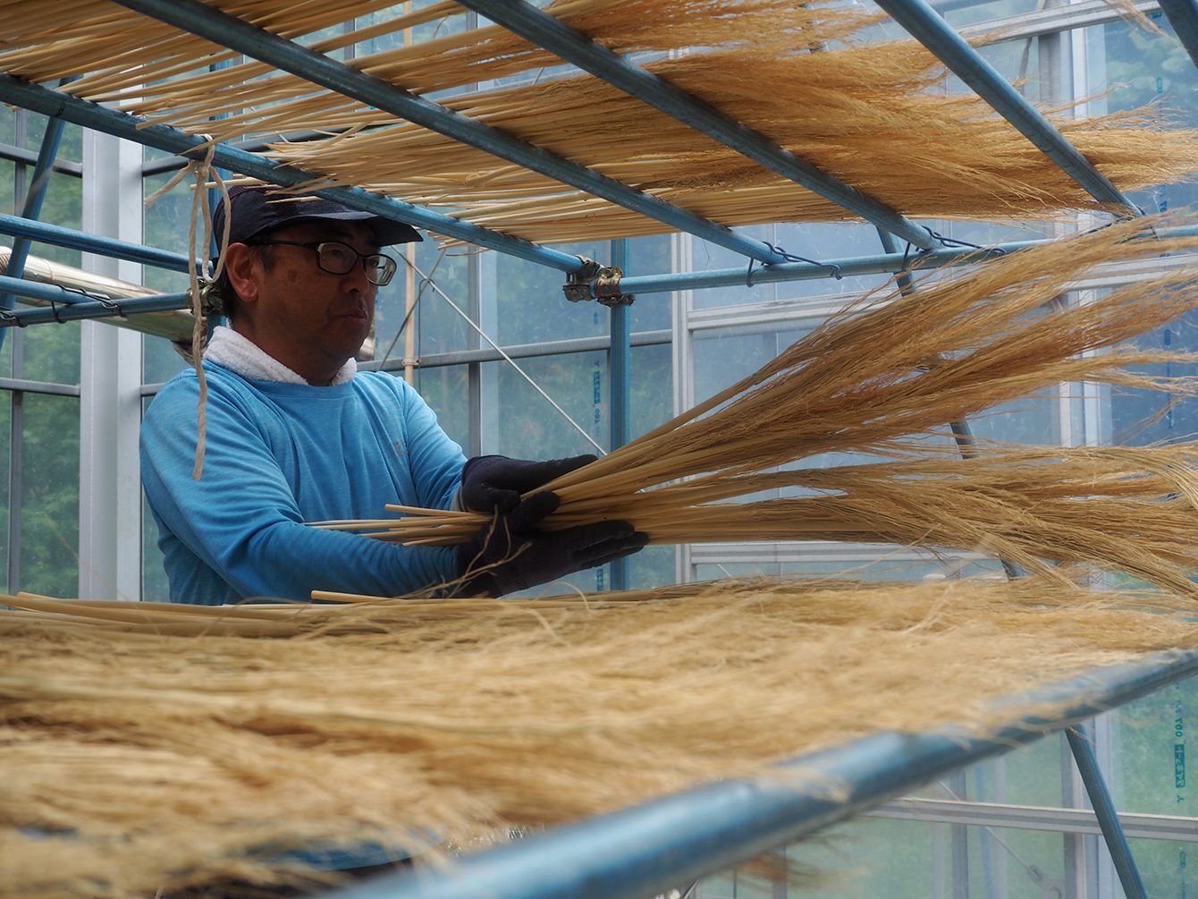 釜茹でにしたホウキモロコシをビニールハウスで乾燥させる。その後再び選別し、編上げ、綴じ作業の工程に進む。刈り取りから1年以上をかけて南部箒が完成する