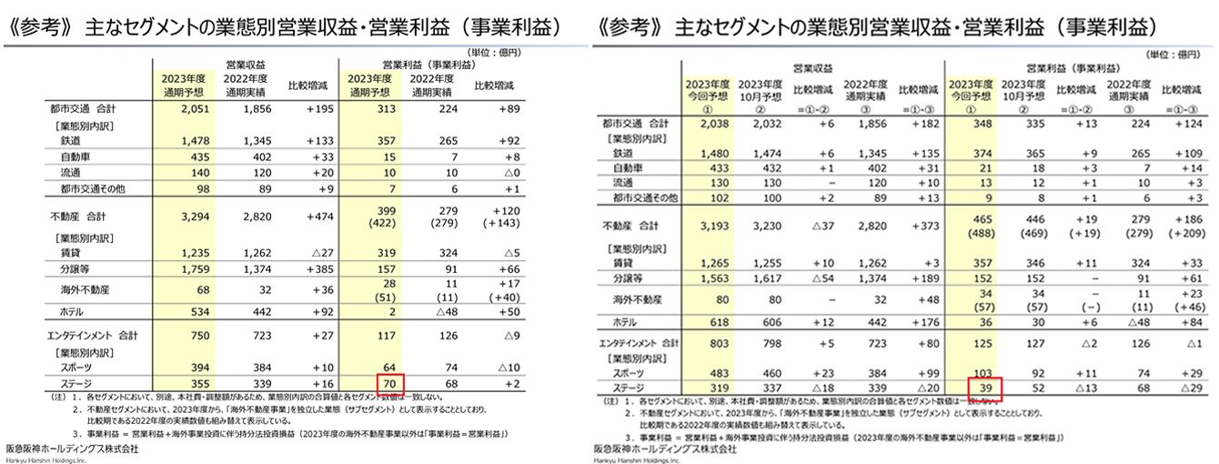 阪急阪神ホールディングスの2023年3月期決算説明会資料(23年5月23日発表)(左)と2024年3月期第3四半期決算補足説明資料(24年2月7日発表)(右)